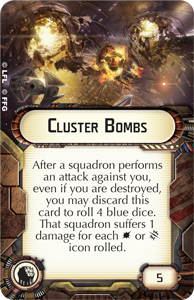 Najgorszym Defensive retrofit są dla mnie Cluster Bombs, zgadzam się tu z Crabbokiem zdecydowanie. 5 punktów za średnio 3 obrażenia dla jednej eskadry i to jeszcze za odrzucenie tej karty to moim zdaniem bardzo słaby interes. Gdyby miała napisane "exhaust" zamiast "discard" byłaby ciekawa albo gdyby kości były czarne albo koszt karty wynosił 2 punkty też byłoby interesująco. Ale jest jak jest.